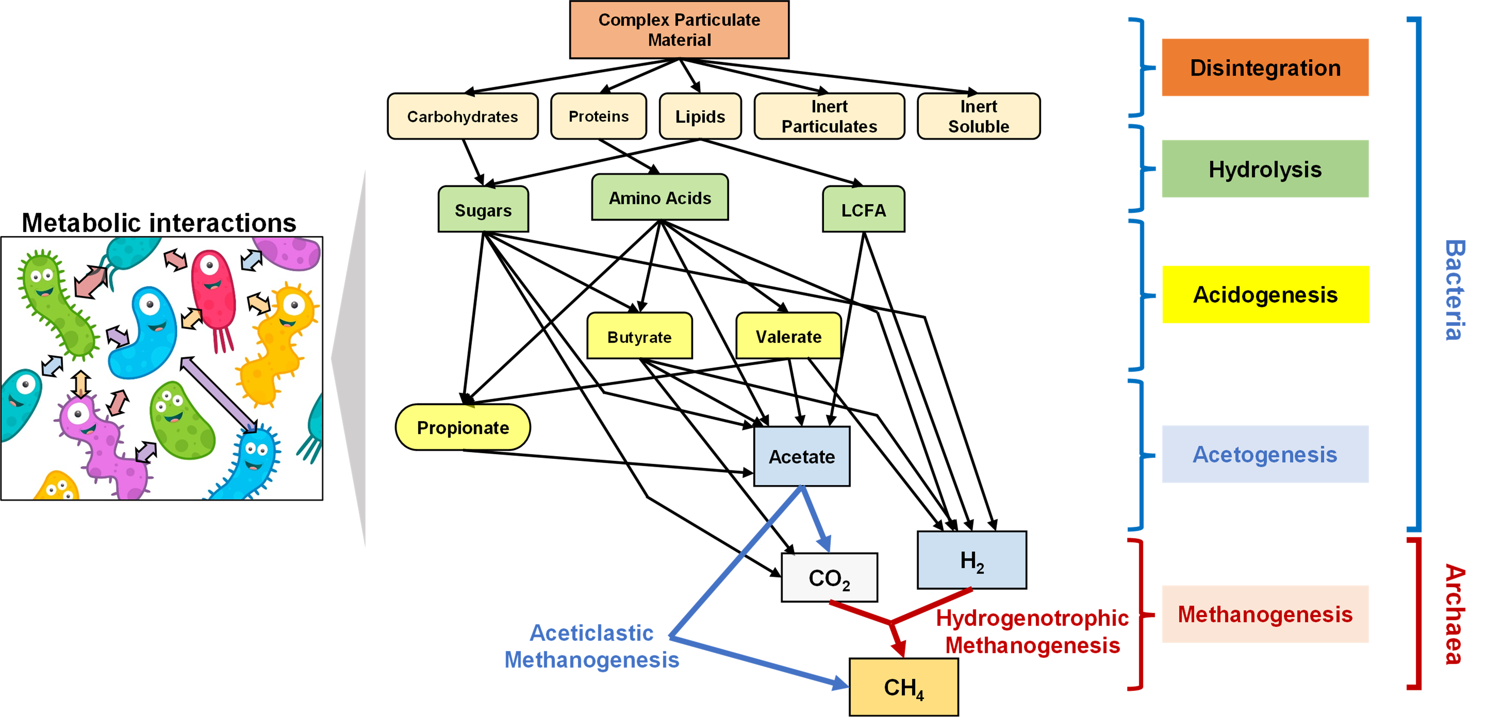 ▶ 혐기소화조로 유입된 잉여 유기물들은 다양한 종류의 미생물 간 대사 네트워크를 통해 아세트산과 같은 휘발성 유기산(Volatile Fetty Acids: VFAs) 및 수소/이산화탄소로 전환됩니다.