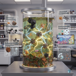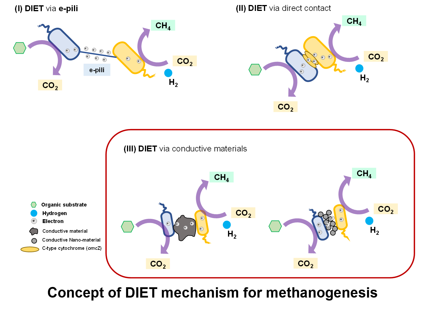 ▶ 특히, 이종 미생물 간 전자전달 매커니즘(Direct Interspecies Electron Transfer mechanism)의 활성화를 통해, 전자전달 미생물exoelectrogen)으로부터 전자수용 미생물(endoelectrogen)에 직접 전자를 전달함으로써, 전통적인 전자운반체(electron shuttle)를 이용하는 방식에 비해 보다 효율적인 방식으로 알려져 있습니다.