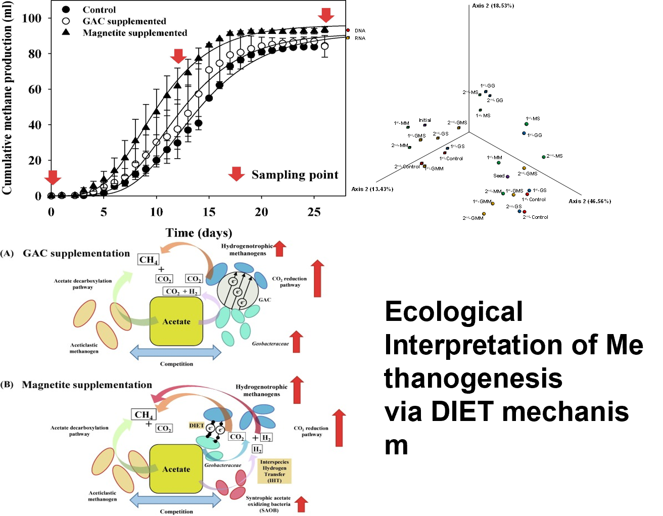 ▶ 이런 메탄생산 과정의 DIET 메커니즘에 대한 미생물생태학적 분석을 통해 베탄생산 대사과정을 극대화하기 위한 최적 DIET 메커니즘 활성화 조건 및 미생물 네트워크 관계를 규명하는 연구를 수행합니다.